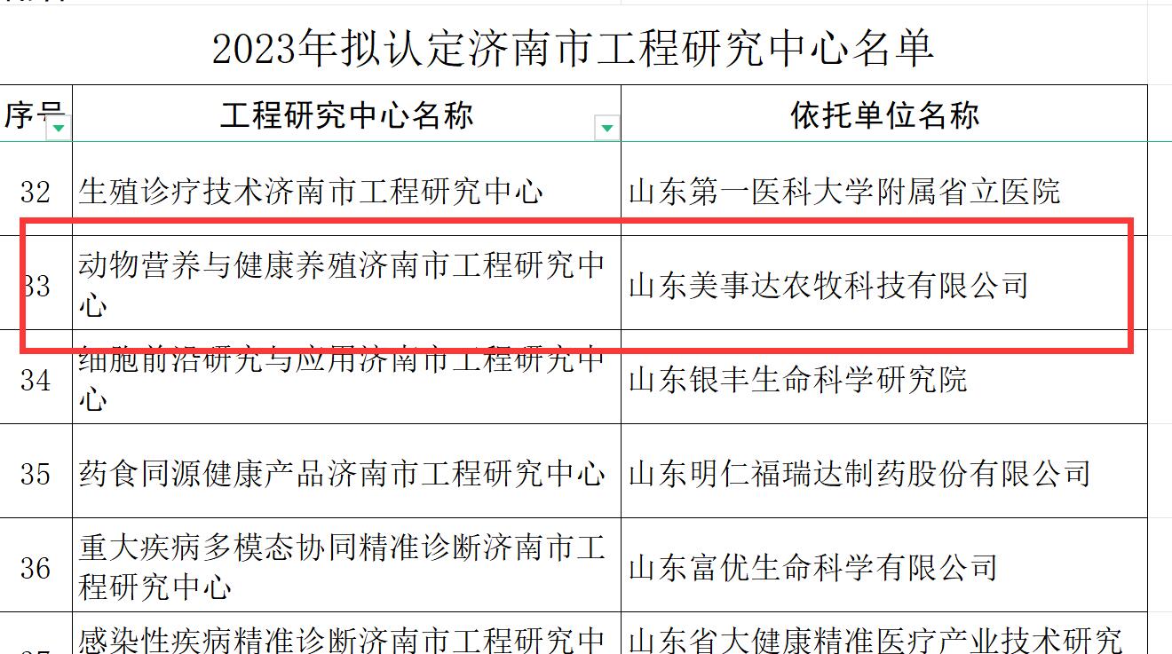 ? ? 近日,濟(jì)南市發(fā)展與改革委員會公示了“2023年濟(jì)南市工程研究中名單”,山東美事達(dá)農(nóng)牧科技有限公司被認(rèn)定為“動物營養(yǎng)與健康養(yǎng)殖濟(jì)南市工程研究中心”。