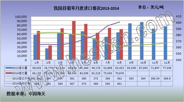 ??? ?據(jù)荷斯坦雜志從中國海關(guān)獲得數(shù)據(jù)統(tǒng)計(jì),20141-8月中國進(jìn)口苜蓿草總計(jì)54.98萬噸,同比增26.15%;進(jìn)口金額總計(jì)20701.27萬美元,同比增26.26%。其中,8月中國進(jìn)口苜蓿草7.07萬噸,同比增11.44%,環(huán)比下降3.90%;進(jìn)口額2831.39萬美元,同比增加23.22%8月苜蓿草平均到岸價(jià)400.62美元/噸,首次突破400美元/噸,同比上升10.57%,環(huán)比上升1.49%