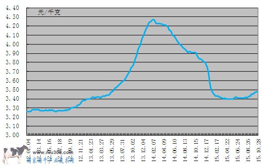 根據農業部對全國生鮮乳的監測,奶價已經連續5個月穩定在3.4元/公斤左右,據農業部定點監測,10月份第4周(采集日為10月28日)內蒙古、河北等10個奶牛主產省(區)生鮮乳平均價格3.48元/公斤。根據奶牛體系對全國220家規模牛場的統計,規模牛場生鮮乳價格連續5個月穩定在3.85元/公斤左右。保持了一年半的生鮮乳價格的下降趨勢基本上已經結束(見圖1、圖2)。